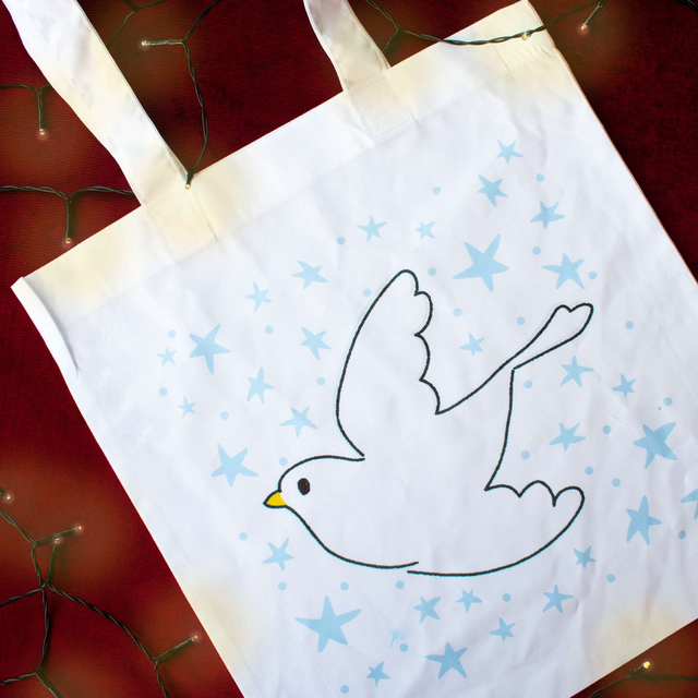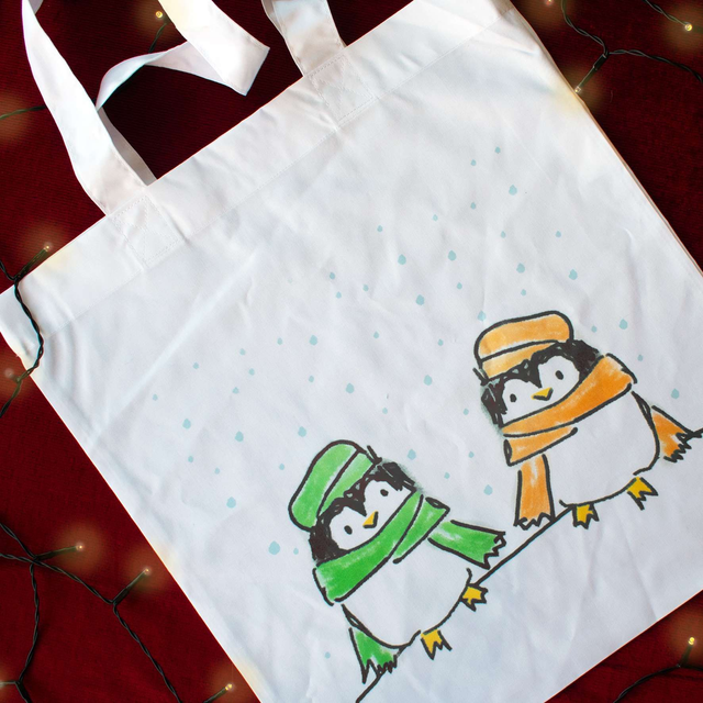 Reusable tote bags perfect for gifting, featuring the artworks from this years Christmas Cards made by Jack, Sophie, Dominic, Janice and Gill.. Each artist used various mediums to create their designs including inks, watercolour, pencil drawings and digital art to showcase their diverse range of styles.